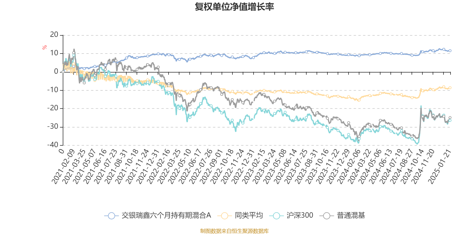 截至1月21日,交银瑞鑫六个月持有期混合A近三个月复权单位净值增长率为0.56%,位于同类可比基金481/670;近半年复权单位净值增长率为1.41%,位于同类可比基金570/670;近一年复权单位净值增长率为2.45%,位于同类可比基金603/664;近三年复权单位净值增长率为1.80%,位于同类可比基金284/525。